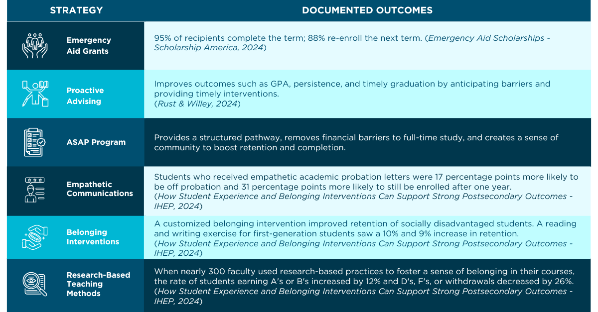 ● Emergency aid programs, offering "just-in-time" grants, effectively prevent dropouts with 95% of recipients completing their term and 88% continuing.