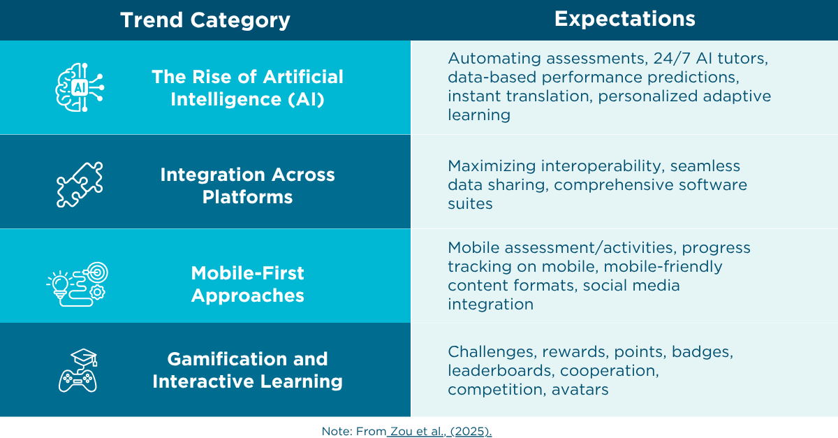 The shift toward a modern "digital campus" is driven by higher education students who expect convenience, personalization, and seamless engagement from their learning platforms. The table below outlines four key EdTech trends directly addressing these demands: from leveraging Artificial Intelligence (AI) for personalized, 24/7 support and adopting Mobile-First Approaches for flexible access, to utilizing Gamification and Platform Integration to deliver interactive and cohesive learning experiences. These capabilities define the next generation of student-centric education.